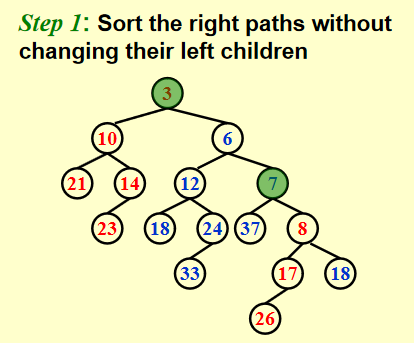 而skew heap在插入的时候,每次都交换左右孩子。(最后的结果是所有原右路径上的节点都变成了合并后的左路径上的节点)